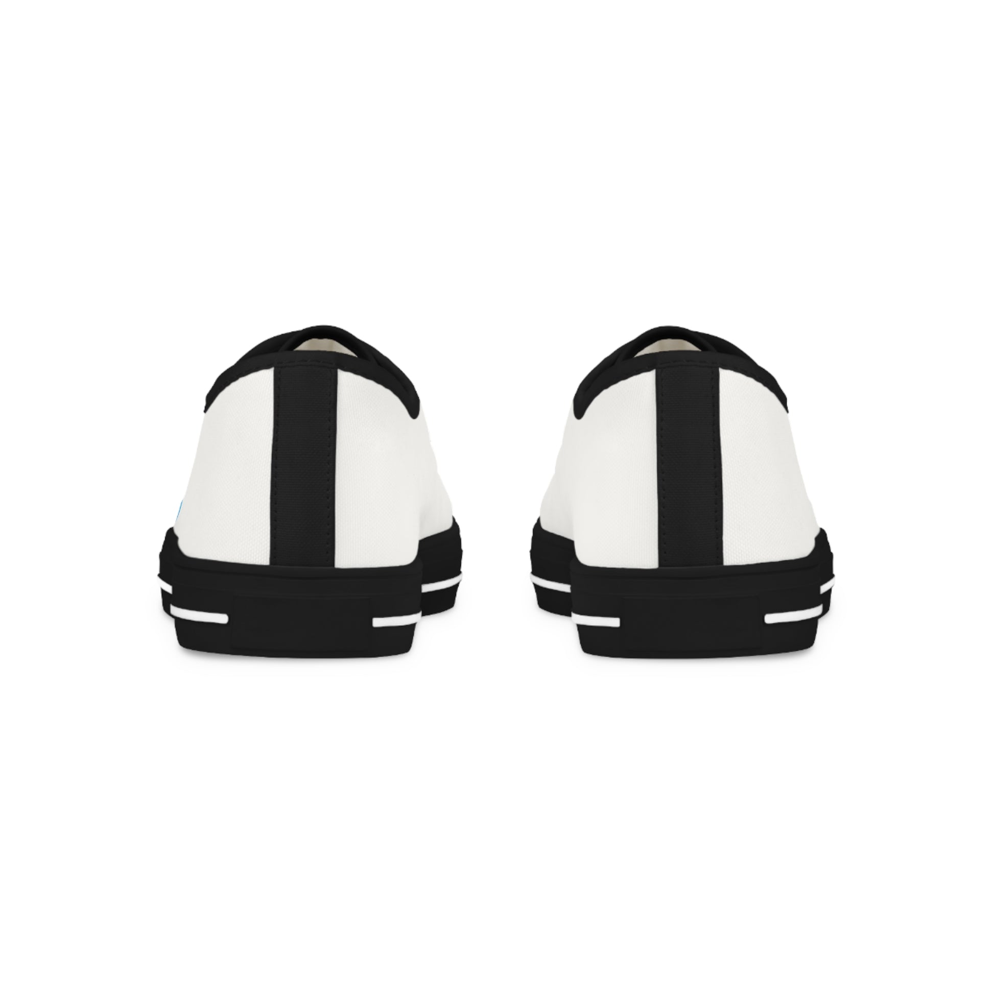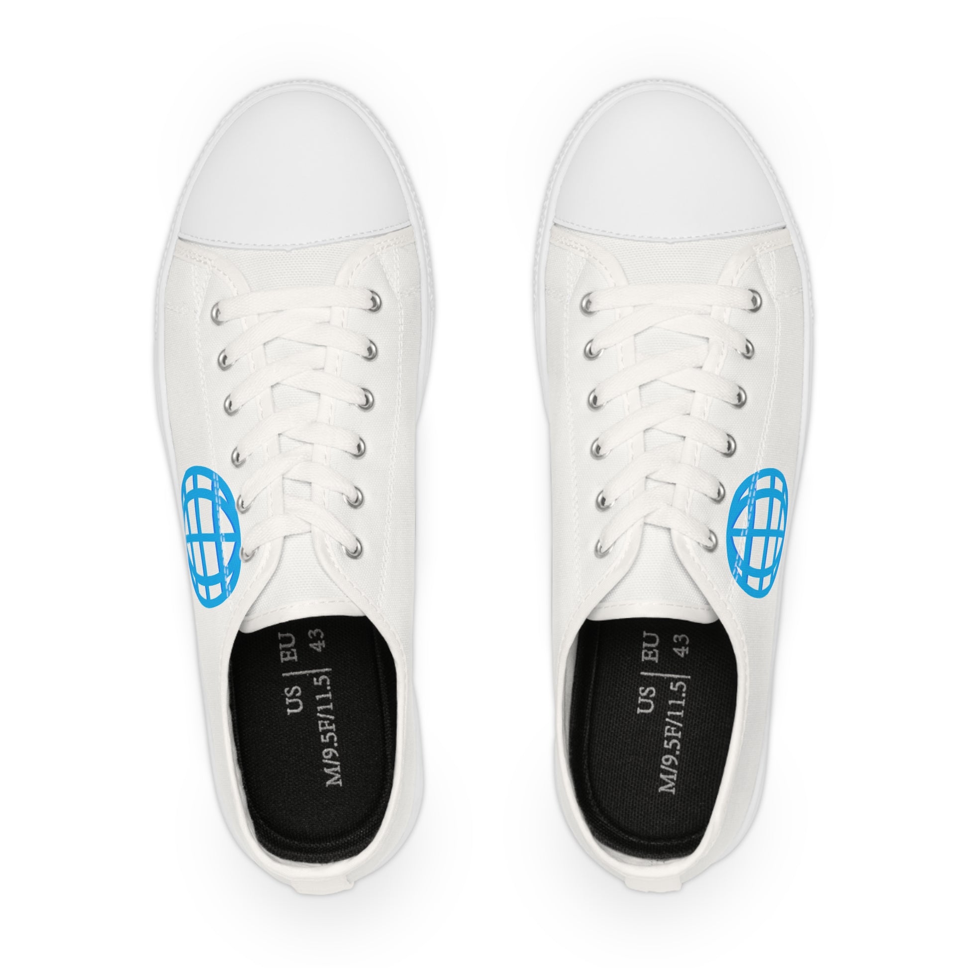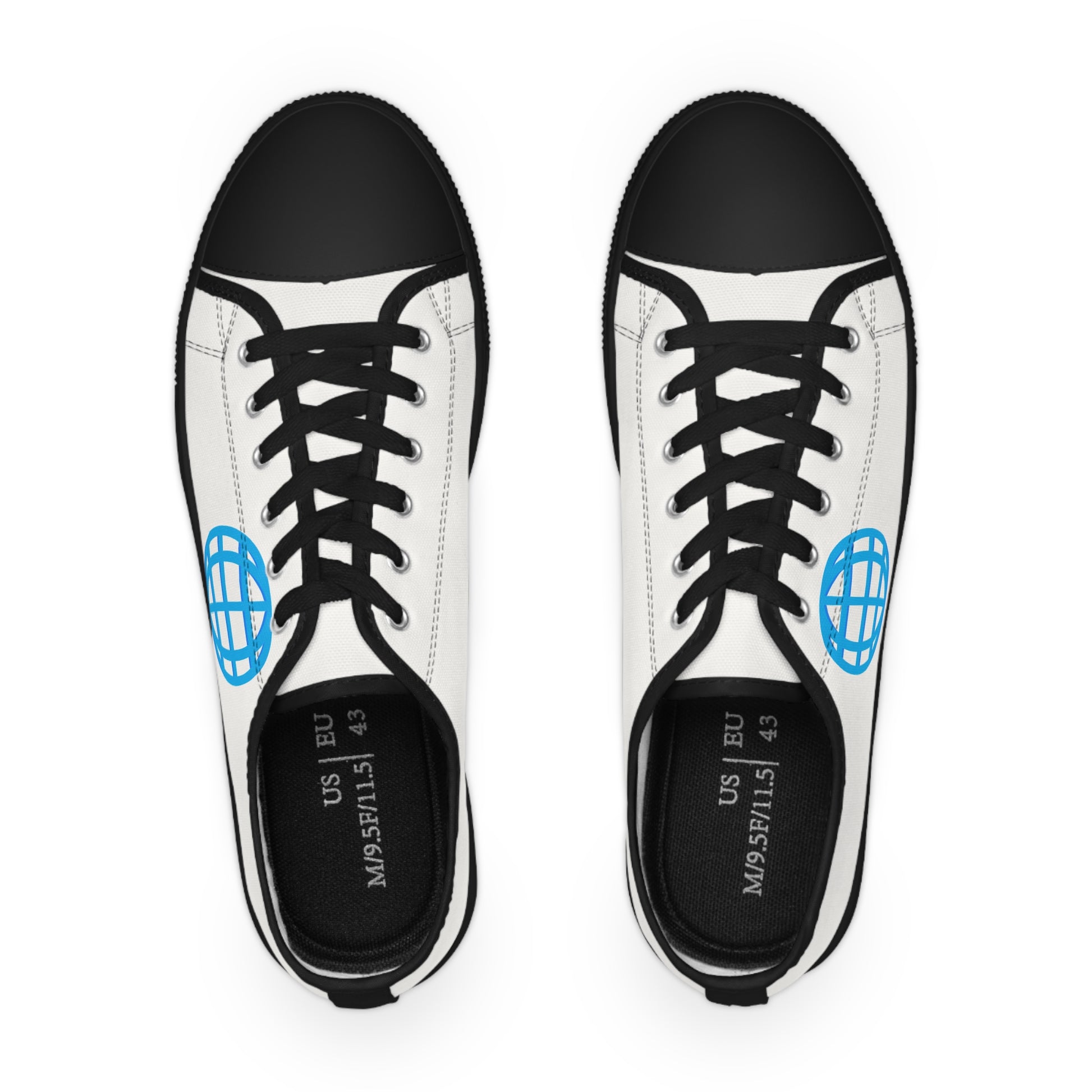 Men's White Low Top Sneakers with Blue Globe Icon — Casual Travel-Inspired Canvas Shoes