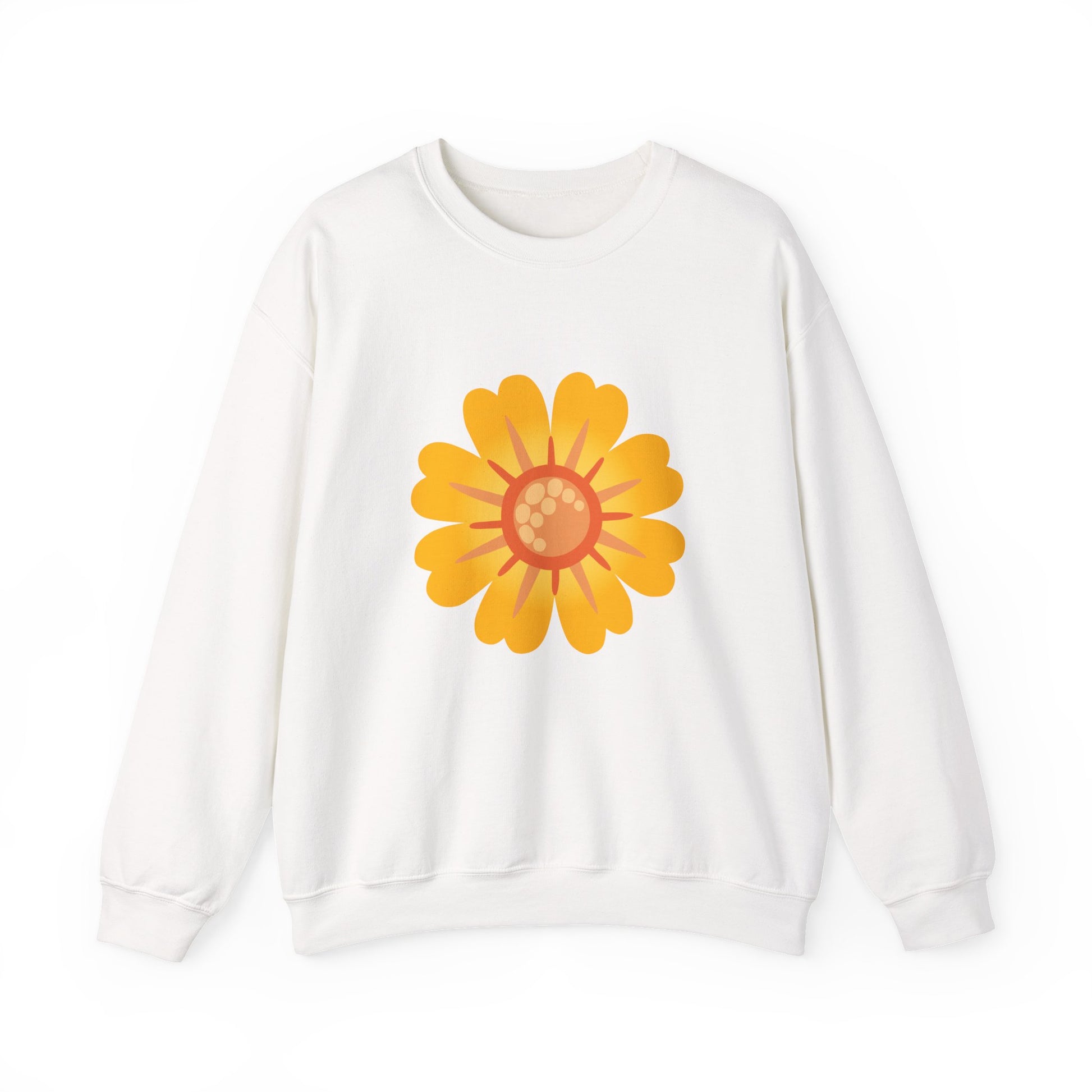 This cozy crew sweatshirt carries a warm, sunny bloom at its heart — a bold, soft-petaled flower printed on a clean white canvas. The midweight cotton-poly blend feels substantial without being stiff, the classic crew silhouette and ribbed collar settle in as soon-as-you-put-it-on comfort. Wear it to brighten a slow morning, pair it with jeans for a neighborhood stroll, or layer it under a jacket for crisp evenings. The embroidered-capable design and durable double-needle stitching mean it’s made to be lived in and loved season after season.