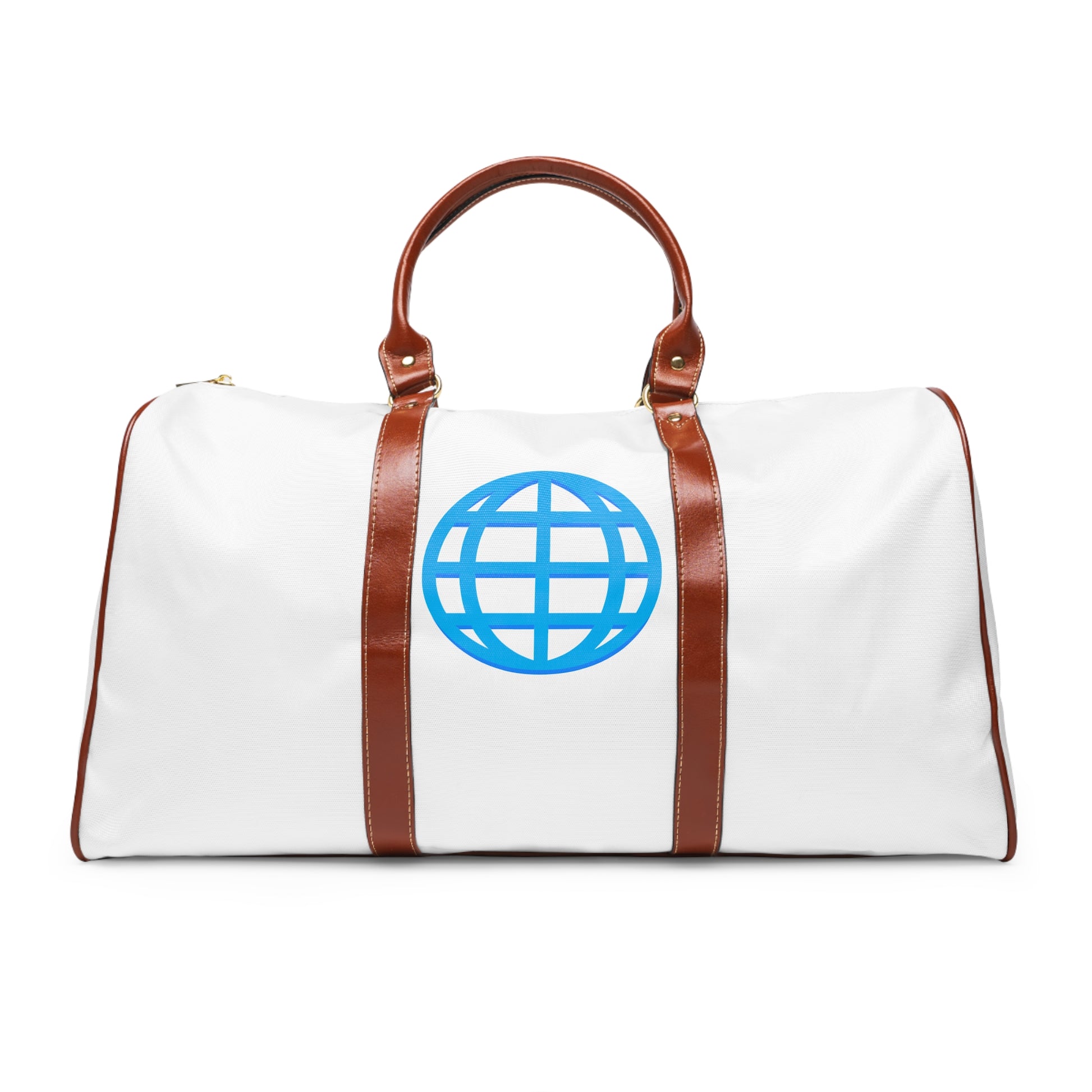 A roomy, weather-ready travel companion that travels light and looks intentional. This waterproof travel bag combines high-grade nylon durability with soft microfiber PU leather trim and brown PU handles for a lived-in, vintage-meets-modern look. The clean white all-over print is punctuated by a bright globe emblem at center, lending a subtle explorer vibe: city layovers, weekend escapes, and coastal drives. Inside, a single open pocket keeps small essentials like your passport or phone within reach. Gold-colored zipper hardware and a polyester lining add a refined touch, while the adjustable shoulder strap and generous 20" × 12" × 9" size make packing and carrying straightforward. Bright, crisp printing keeps the design vivid through many trips.