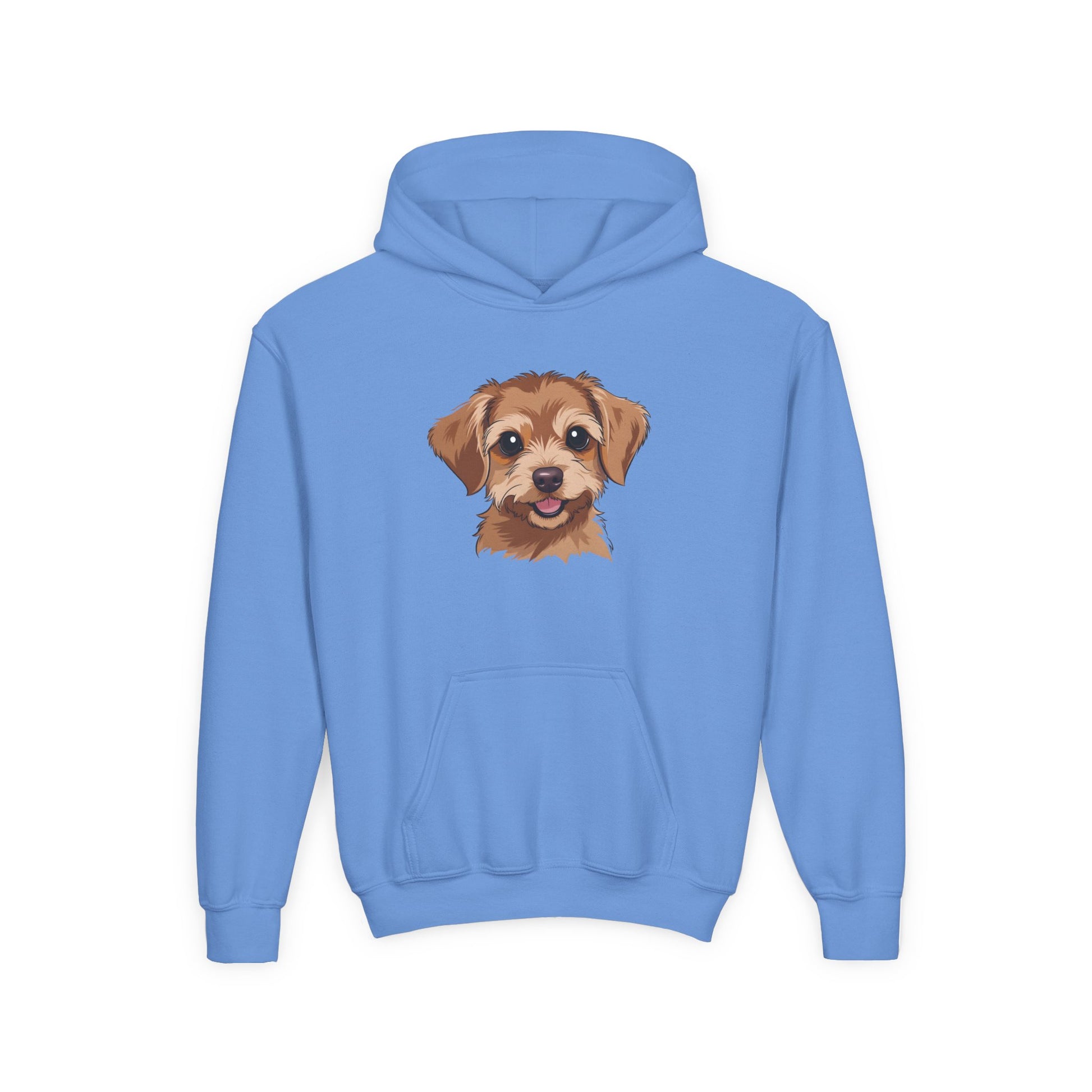 This cozy youth hoodie brings a little friendly face into everyday wear. Soft midweight fabric and a roomy kangaroo pocket make it a go-to for brisk school runs, dog-park mornings, or chill afternoons at home. The printed puppy portrait sits centered on the chest, cheerful and detailed, while optional embroidery adds a subtle personalized touch. It wears like a reliable companion — warm at the core, easy to move in, and made to stand up to playground energy and repeated washings.
